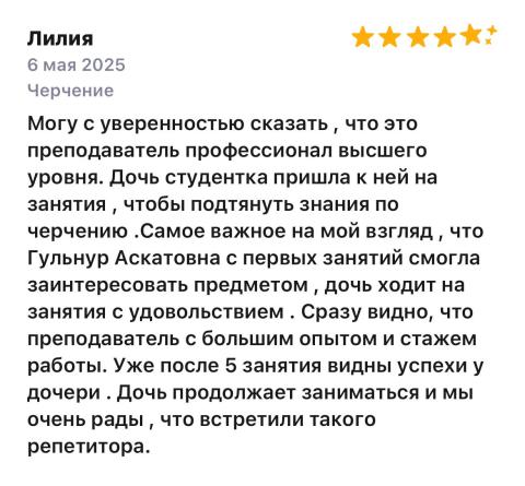 Гульнар Аскатовна - прекрасный наставник, профессионал который знает и любит свое дело, душой болеет за своих учеников.Всегда доброжелательна, вежлива и безукоризненно пунктуальна. Она сильно помогла мне подготовится к вступительному испытанию для поступления на моушн-дизайн КФУ. Я сдал экзамен на 87 баллов и смог пройти на бюджет)Безусловно рекомендую всем